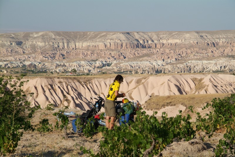 Diese einzigartige von einem Vulkan erschaffende Landschaft aus Tuffstein, entdecken wir gespannt Zentimeter für Zentimeter und kommen aus dem Staunen nicht mehr heraus. Wir radeln vorbei an Selime, wo die Schlümpfe höchstpersönlich zu wohnen scheinen und von wo aus eine 14km lange Schlucht ins Ihlara-Tal führt,wo unzählige Felsenkirchen und - wohnungen in die Steilwände gehauen sind. Vor Nefsehir machen wir Halt an einer Petrol Ofisi Tankstelle und als Mandy aus der Toilette kommt, hockt ein Mann davor, der schnell in die Männertoilette rennt. Wie sich herausstellt ist es ein Angestellter, der behauptete zu putzen!? Wir lassen uns das nicht gefallen und machen ihm mit dem Wort "Ayip" (Schande) klar, das das nicht in Ordnung ist und Benny fragt den ungläubigen Kollegen: "Was würdest du tun wenn das jemand bei deiner Frau macht? Der nickt bloss und endlich kommt eine Entschuldigung.