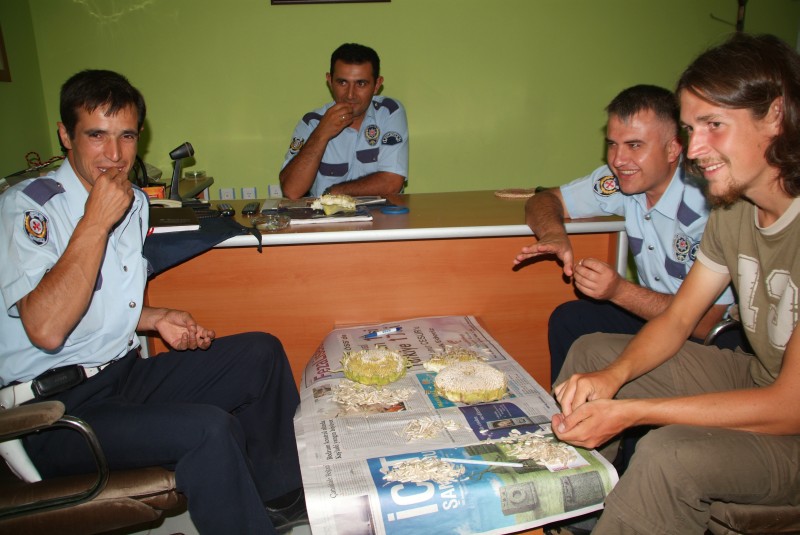Natürlich besichtigen wir auch Göreme und lernen dort auf einem gemütlichen Zeltplatz Abends noch einen deutschen Entwicklungshelfer aus Saudi- Arabien und seine türkische Frau kennen und erfahren noch spannende Geschichten über Mekka und Saudi- Arabien. Wir haben die Erfahrung gemacht, das Leute uns immer vor dem Land warnen, welches wir als nächstes bereisen (und meistens nie dort gewesen sind), doch bisher hat sich alles als unwahr behauptet. Vor der Osttürkei jedoch haben wir Respekt, da dort vor einigen Monaten ein Schweizer Pärchen beim Wildzelten böse überfallen worden sind. Jeden Tag ein Hotel nehmen können und wollen wir nicht und so suchen wir uns immer relativ frühzeitig einen Schlafplatz. Glück hatten wir fast immer an Tankstellen, bei einer Teppichfirma aber auch öfter bei der hiesigen Verkehrspolizei (Bölge Traffik Station), die uns immer sehr nett aufnahmen und mit denen wir oft viel Spass hatten.
