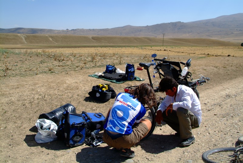 Nach Kappadokien wollten wir mal ein bischen mehr Gas geben, da unsere Iranvisa für uns bereit lagen uns wir ein bischen Angst hatten dass Sie wieder verfallen könnten. Doch im Endeffekt war es ganz schön anstrengend, jeden Tag über 100 Kilometer zu schaffen. Denn in der Osttürkei erwarteten uns 5 Passhöhen über 2000 Meter. Aber andererseits war es hier sogar fast angenehmer zu fahren als an der Küste, da kein so heißes und schwüles Klima herrscht. Jedoch mussten wir in der Osttürkei über zum Teil ekelhafte Pisten fahren (wir fuhren immer auf den zentralen Hauptstrassen), die teilweise erst im Begriff der Fertigstellung waren. Viel schlimmer als der Belag war jedoch der ekelhaft stinkende Teer, der zum Teil stundenlang nicht nur an unseren Reifen sondern auch in unseren Nasen hängen blieb.