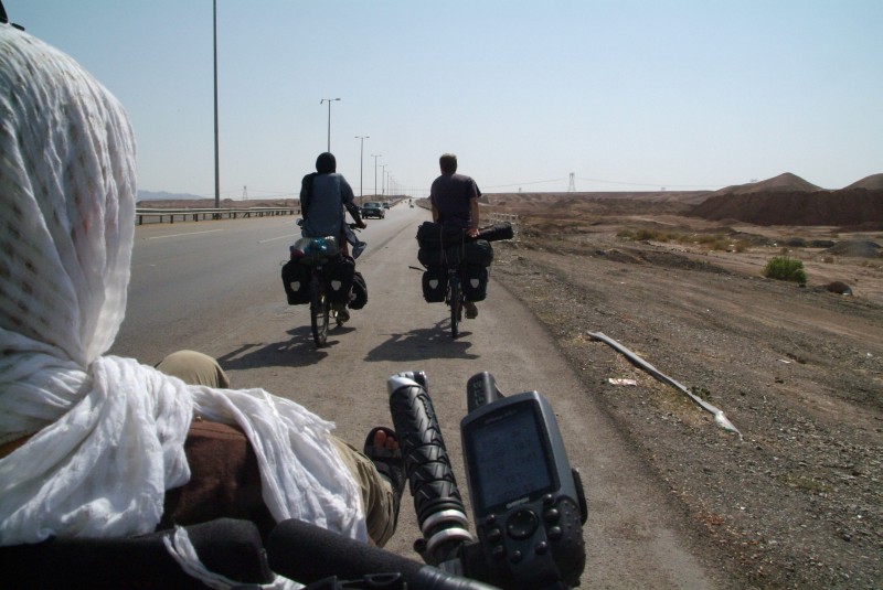 Am nächsten Morgen werden wir vom Klopfen der Arbeiter wach und sind erst sehr spät auf dem Rad. Bald sind wir auf der Autobahn, auf der es sich wesentlich ruhiger fahren lässt als auf der Landstraße, da dort keine LKW fahren dürfen. Die Landschaft ist relativ karg und wüstenartig, nur wenige kleine Sträucher wachsen noch am Boden. Auch zum Übernachten zieht es uns in die Halbwüste, wo wir ohne Zelt unter dem wunderbar klaren Sternenhimmel schlafen, der nur dadurch gestört wird, dass fast Vollmond ist. Auch anderntags fahren wir weiter durch die Halbwüste an einem Salzsee vorbei. An diesem Mittag können wir der Hitze entgehen, da wie eine Oase in der Wüste eine Tankstelle mit Laden und klimatisiertem Restaurant auftaucht, an der wir uns erst mal ausgiebig erholen und mit Fast Food unsere Mägen füllen. Nachmittags rollen wir weiter in Richtung Qom, neben Maschad eines der beiden religiösen Zentren des Iran. In Qom steht nämlich die berühmte Grabmoschee (um 1600) mit dem Schrein von Fateme-ye Ma'sume, der Schwester des 8. Imam Ali ar-Rida. (Im Islam gibt es 12 heilige Imame, 11 davon zu Zeiten Mohammeds, und der 12. wird noch erwartet).