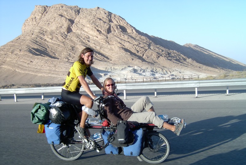 Den Tag darauf flicken wir unseren ersten Platten und als endlich alles auf den Raedern ist, stellt auch Laura bei sich einen Platten fest. Nachdem alles repariert ist, gibt es erst einmal ein grosses ausfuehrliches Fruestueck, welches uns den Park in solch einem gemuetlichen Licht erscheinen laesst, so dass wir spontan noch einen Tag bleiben, faul in der Sonne liegen und uns eine Dusche basteln. Frisch gestaerkt und gut ausgeruht klingelt schon am naechsten Tag gegen 6 Uhr der Wecker, da wir in zwei Tagen im schoenen Isfahan sein wollen und zudem unsere Reisepaesse in Teheran mit den hoffentlich auf 30 Tage verlaengerten Visa abgeholt werden wollen. Es ist gut frueh auf dem Rad zu sein, da die wuestenartige Gegend sich tagsueber schnell erwaermt und wir von Kashan aus ein gutes Stueck bergauf fahren. Nur noch wenige Doerfer liegen auf der Strecke und wir benutzen das erste Mal zusaetzlich unseren 10 Liter Wassersack, um ueber den Tag zu kommen.