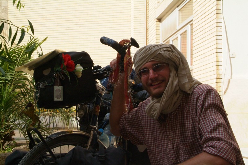 In Teheran haben wir dann noch einen schönen Nachmittag mit Nasi, bevor wir wieder mit dem Nachtzug zurück nach Esfahan fahren. Im Zug können wir zwar besser schlafen als im Bus, aber dennoch sind wir froh, dass wir demnächst wieder mit dem Fahrrad weiterreisen können. In unserer Herberge "Amir Kabil" versammeln sich wie durch Zauberhand neben den "normalen" Reisenden auch viele Radler aus der Schweiz, Frankreich und den Niederlanden, die wir zum Teil schon auf der Reise kennengelernt hatten. Zum Beispiel sind hier die beiden Reiseradler Patrick und Sophie, die von Holland nach Beijing radeln möchten, oder die beiden Franzosen Emanuel und Yohann, die schon seit über einem Jahr unterwegs sind und von Frankreich über Afrika, Amerika und Asien in den Iran gekommen sind. Auch treffen wir hier den sehr spannenden Mick aus Frankreich, der schon seit 10 Jahren unterwegs ist und nun das erste Mal zurück nach Frankreich geht. Fuer uns ist das eine tolle Moeglichkeit uns mit Gleichgesinnten auszutauschen, sei es in dem schoenen Innenhof des Hostels, in der Teestube oder auf eine Wasserpfeife im Cafe an der schoen beleuchteten Bruecke am Fluss. Es wird schnell zum Ritual, erst etwas essen zu gehen, und dann sich auf eine Wasserpfeife am Fluss zusammenzusetzen und danach gegen Mitternacht ein Eis zu essen. Auch wir merken, dass so langsam der Herbst kommt- wir koennen nur noch tagsueber barfuss gehen und Abends ziehen wir uns doch schon mal einen leichten Pullover ueber ;-)