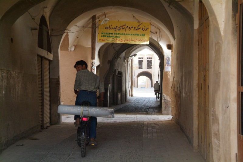Eigentlich wollen wir von Yazd bis Kerman radeln und ab dort auf andere Verkehrsmittel umsteigen, da wir langsam aber sicher die Region Belutschistan erreichen, wo die Hauptschmuggelroute für Drogen aus Afghanistan und Pakistan entlangführt, und wo vor drei Jahren zwei deutsche und ein irischer Radler entführt wurden. Wir befinden uns jedenfalls noch weit vor Belutschistan, in einem Gebiet das für Radfahrer als sicher gilt. Doch 60 Kilometer hinter Yazd sehen wir auf der anderen Strassenseite einen vermummten Motoradfahrer mit Gewehr auf der Schulter, den wir nicht als Polizisten identifizieren können. Als er uns sieht, wendet er prompt und ist bald in Begleitung von einem zweiten Motoradfahrer, der ebenfalls vermummt ist. Beide fahren erst an uns vorbei, und halten dann kurze Zeit später am Strassenrand und telefonieren mit dem Handy. Was sind das für Typen? Uns ist auf jeden fall mulmig und wir halten kurzerhand einen LKW- Fahrer an, der uns lieberweise auf der Ladefläche bis nach Kerman mitnimmt und sogar noch mit Tee versorgt. Im Hotel treffen wir Patrick und Sophie, die auch mit dem Rad unterwegs sind und die hinter Yazd eine Polizeieskorte bekommen hatten. Jedesmal, wenn Motoradfahrer in ihre Nähe kamen, ist das Polizeiauto vorgefahren und hat sie von ihnen ferngehalten. Auch wenn wir zuvor überlegt hatten, ob es nötig war, den LKW zu nehmen, sind wir nach diesen Erzählungen froh, dass wir uns so entschieden haben.