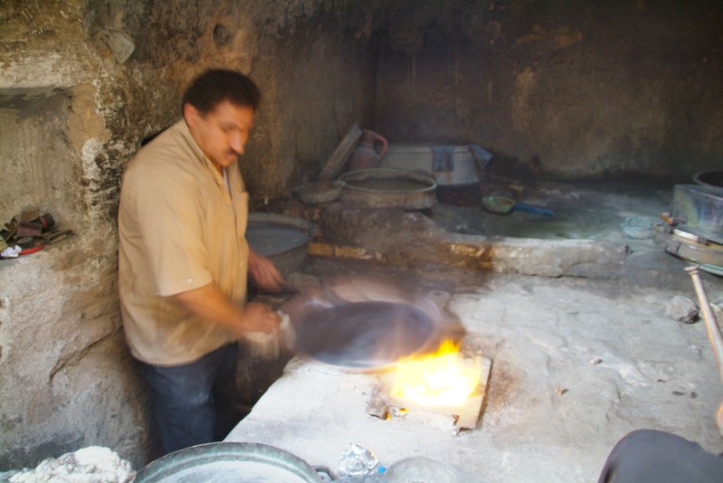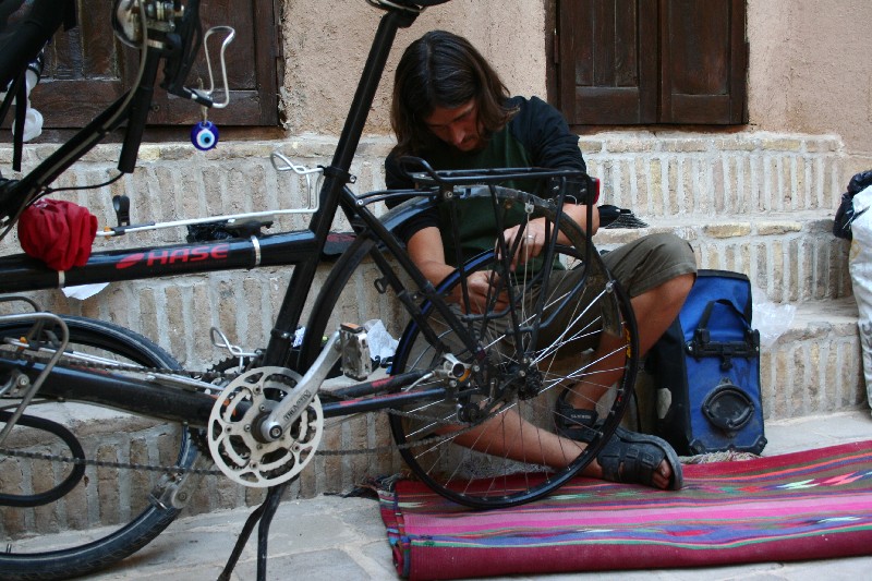 Das Silkroadhotel in Yazd hat uns mit freundlichem Personal einfach zu sehr verwöhnt. Im "Touristenhotel des Jahres" (Akhabanhotel) zelten wir auf einem schäbigem Betonhof, und das Wort das der Hotelbesitzer am besten beherrscht beginnt mit 'Mo' und endet mit 'ney'. Die einzigen Lichtblicke sind die uns bereits bekannten Reiseradler Theo, Laura, Patrick und Sophie, zu denen sich noch das nette Pärchen Ela und Marco gesellt, die mit 'Erbsli', ihrem erbsgrünen, fantastisch ausgestattetem VW-Bus Richtung Osten unterwegs sind. Wir kommen aus dem Staunen nicht mehr heraus, was die beiden alles dabeihaben und bedauern ein paar Sekunden, nicht mehr Platz auf dem Tandem zu haben. Wir haben noch einen schönen Abend, und zusammenn mit den anderen und dem gelernten Koch Patrick machen wir wunderbar schmackhafte Pfannkuchen.
