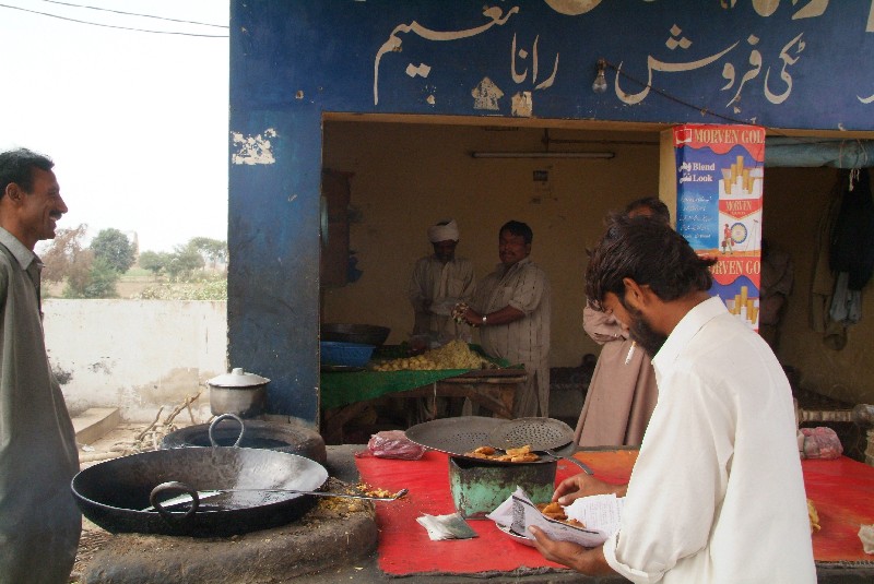 Doch endlich ist es dann soweit: Wir sitzen wieder auf dem Rad und fahren aus Multan raus. Unangenehm ist zwar der Lärm und Dreck der zahllosen anderen "Verkehrsteilnehmer" in Form von Fahrrädern, stinkenden Rikschahs, knatternden Mopeds, Ochsen-, Pferde- oder Eselkarren, in dauerhupenden Bussen, Autos und LKW. Jedoch lässt es sich - abgesehen vom Lärm und Dreck - durch den insgesamt langsameren Verkehrsfluss für uns angenehmer fahren als beispielsweise im Iran, wo es in den Städten quasi nur rasende Autos gibt. Und je mehr wir uns von der Stadt entfernen, desto besser radelt es sich. Hier sind angenehmerweise auch unzählige Straßenstände an denen wir Rast machen können. Und nicht nur neben der Straße ist einiges los, auch die Straße selbst scheint zu leben. Einheimische Radfahrer bummeln meist im Schneckentempo vor sich hin, bis Sie diese merkwürdigen Ausländer auf diesem sonderbaren Gefährt an sich vorbeifahren sehen, uns Sie dann natürlich Gas geben, um zu dieser merkwürdigen Erscheinung auf 2 Rädern aufzuschliessen. Dieses unerklärliche Phänomen wollen sie sich dann verständlicherweise so lange wie möglich anzuschauen.