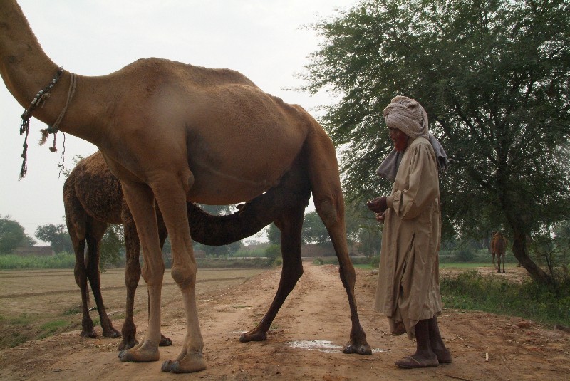 Lahore ist am nächsten Tag nicht mehr weit, aber da uns die starke Luftverschmutzung auf die Nerven geht und wir in Lahore keine Besserung erwarten, fahren wir von der Hauptstrasse ab und durch kleine Dörfer zum "Wildnispark" Changa Manga. Der Weg dorthin führt uns über viele kleine verschlafene Dörfer, Bambushaine und Rosenfelder! Als wir am Nachmittag ankommen, sind wir von dem Park ein bisschen enttäuscht, da er ausser den Rasenflächen und Klettergerüsten scheinbar nichts zu bieten hat. Nach einer Nacht im nahen Hotelkomplex, wo wir ausser den Geckos die einzigen Gäste sind, fahren wir zunächst doch noch mal Richtung Park, um dort einen entspannten Vormittag zu verbringen, Aber wir ergreifen dann blitzschnell die Flucht, als uns in fünf Minuten mindestens zehn Busse mit johlenden, kreischenden Schulkindern überholen- alle Schulen Pakistans scheinen einen Ausflug in diesen Park zu machen! Als Entschädigung treffen wir in einem der kleinen Dörfer noch einen netten Einheimischen, der uns Fäden von seidenspinnenden Raupen zeigt und für uns eine Stange leckeres Zuckerrohr frisch vom Feld holt- sehr lecker! Wir fahren gerade weiter, doch wieder springt uns etwas ins Auge: Auf einem Feld frisst sich gerade eine Kamelherde von Baum zu Baum! Wir fahren sofort hin, und der Hirte ist so freundlich uns alle Tiere geduldig zu zeigen.