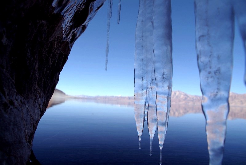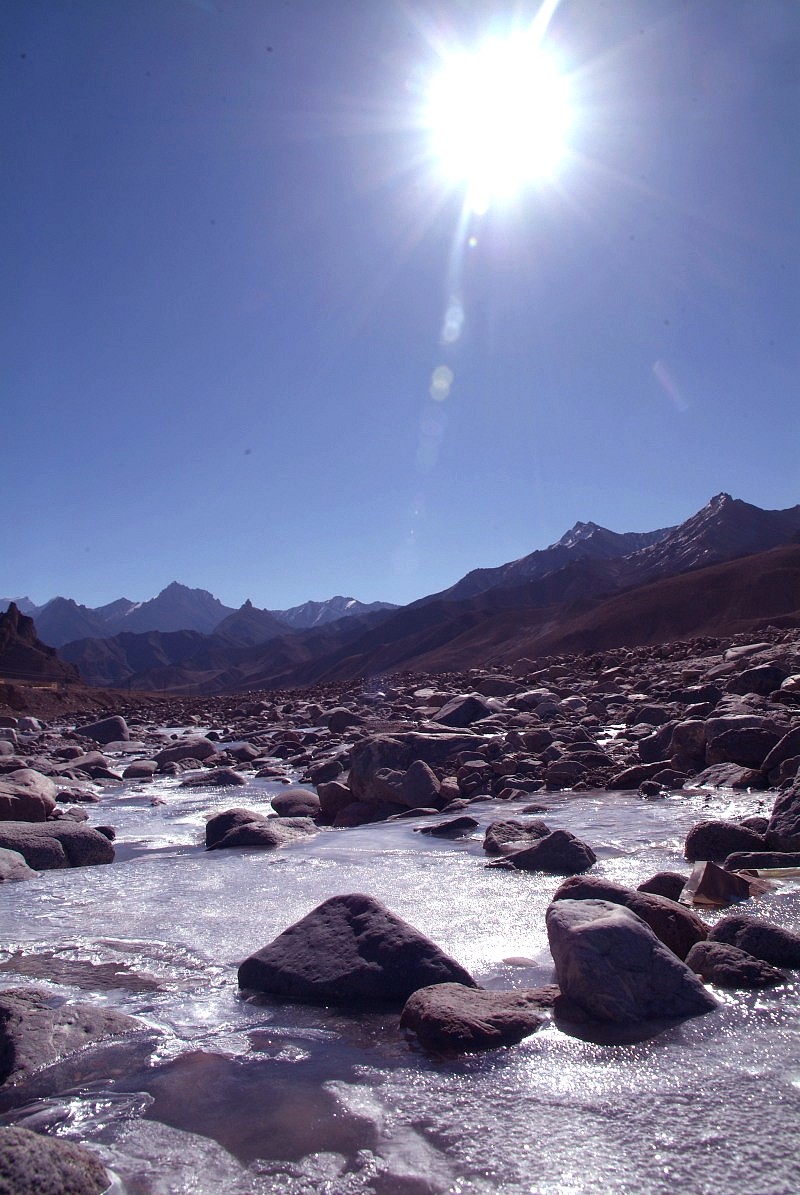 Ich kann mich selten daran erinnnern, so wenig Lust zum Radfahren gehabt zu haben. Eine unschuldige Frage am Morgen löst eine Lawine kleiner Anspannungen los, und wirbelt eine Menge Missverständnisse auf. Kurz gesagt, wir streiten uns. Zu allem Übel reisst auch noch mein Daunenüberschuh, den ich besonders heute dringend brauche in der Kälte, und als ich ihn im kalten Wind schnell mit Angelsehne flicke, platzt mein rechter ramponierter Daumen auf und fängt an zu bluten. Mist! Lustlos radele ich die ersten Kilometer, und erst nach einer kurzen Pause mit Tee, Keksen und einem klärenden Gespräch fühle ich mich gestärkt und bereit weiterzufahren. Von einem breiten Flusstal führt uns die Strasse in die Berge, unserem ersten Fünftausender Pass entgegen. Von weitem schon sehen wir einen Gletscher, der uns seine Zunge wie bei einem "Bäh" entgegenstreckt und dessen kaltes Wasser Eistreppen in einem Fluss formt. So etwas habe ich noch nicht gesehen! Als wir noch höher steigen, sehen wir, wie sich der Eissfluss im Tal netzartig verzweigt. Überall knackt es, die Sonne taut gefrorene Bäche auf, und auch wir nutzen die Wärme und trocknen unsere Schlafsäcke und das Zelt, die wie jeden Morgen nass sind von unserer Atemluft in der Nacht. Heute schlafen wir in einer halbwegs windgeschützten Stelle, einer Art Baggerloch. Wir essen noch den Reis vom Vortag, und in der Nacht schlafen wir nur wenig, es will einfach nicht warm werden. Unsere Schlafsäcke sollen laut Hersteller bei Minus 18 Grad komfortabel warm sein, doch unser Thermometer ist am Anschlag bei Minus 25 Grad, und wir wissen nicht wie kalt es ist. Übermüdet wachen wir morgens auf. Es war so kalt dass ich ab vier Uhr morgens jede halbe Stunde auf den Wecker geschaut habe. Die Sonne ist zwar schon aufgegangen, doch sie scheint noch lange nicht auf unser Zelt, und es ist eisigkalt. Benny jedoch will unbedingt aufstehen und Wasser machen, meine Einwände, dass es doch noch viel zu früh sei und draussen zu kalt, wischt er hinweg. "Das geht schon" sagt er, zieht sich mehrere Schichten an und stiefelt hinaus. Nur 10 Minuten später kriecht ein Eisklotz zurück in den Schlafsack und brummelt: " Morgen stehe ich nicht mehr so früh auf" Aber mein Held hat tapfer das Wasser heiss gemacht und so können wir doch noch heissen Kaffee trinken. Laut dem Italiener Massimo soll es ja in Tibet wärmer werden (haha), das Aksai Chin Plateau ist jedenfalls schw...kalt. Aber noch sind wir ja nicht in Tibet.