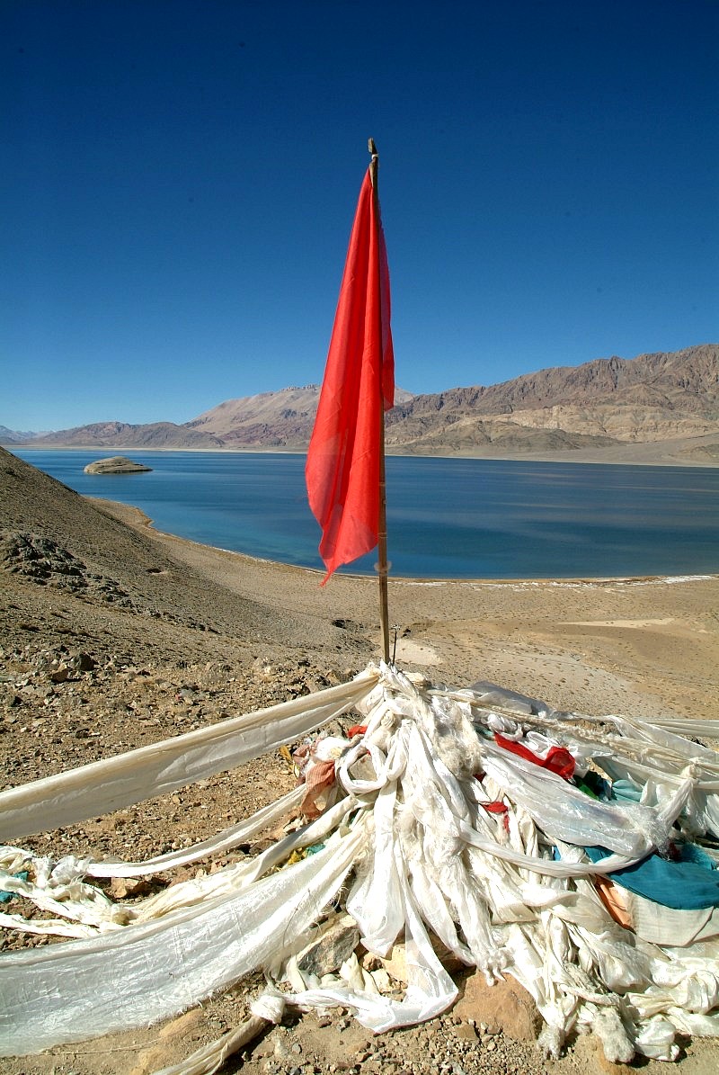 Nun sind wir endlich in Tibet und tatsächlich scheint es hier wärmer zu sein, denn nur wenig Schnee liegt auf umliegenden Berggipfeln. Dann hatte der Italiener Massimo ja doch recht, zu unserer Freude. Die Strassen jedoch scheinen so schlecht zu sein, wie nie zuvor, wir fahren auf einer bunten Mischung aus Waschbrett-, Stein- und Sandpiste, nachdem wir den vorerst höchsten Pass unserer Reise relativ locker raufgeradelt sind, den 5401 Meter hohen Kishan La Pass. Seit wir in Tibet sind, flattern an sogenannten "Kraftplätzen" wie Berggipfeln und Seen die bunten Gebetsflaggen der Tibeter, die aufgehängt werden um die Luft zu bereinigen und die Götter zu besänftigen. Die Farben rot, grün, gelb, blau und weiss repräsentieren die Elemente Feuer, Holz, Erde, Wasser und Eisen. Unser Etappenziel Ali ist nicht mehr weit, doch wir legen noch einen letzten Ruhetag in Domar ein. Dieser Ort ist wie Rutok Xian ein chinesischer Militärstützpunkt und die meisten Läden haben chinesische oder uighurische Besitzer, doch auch einige Tibeter leben hier.