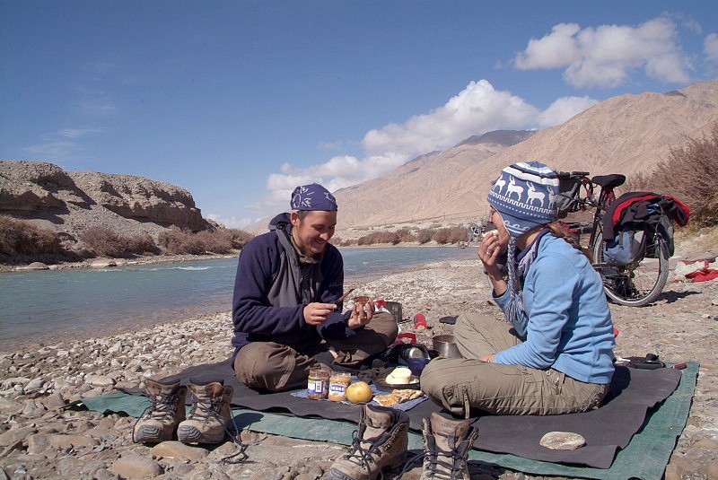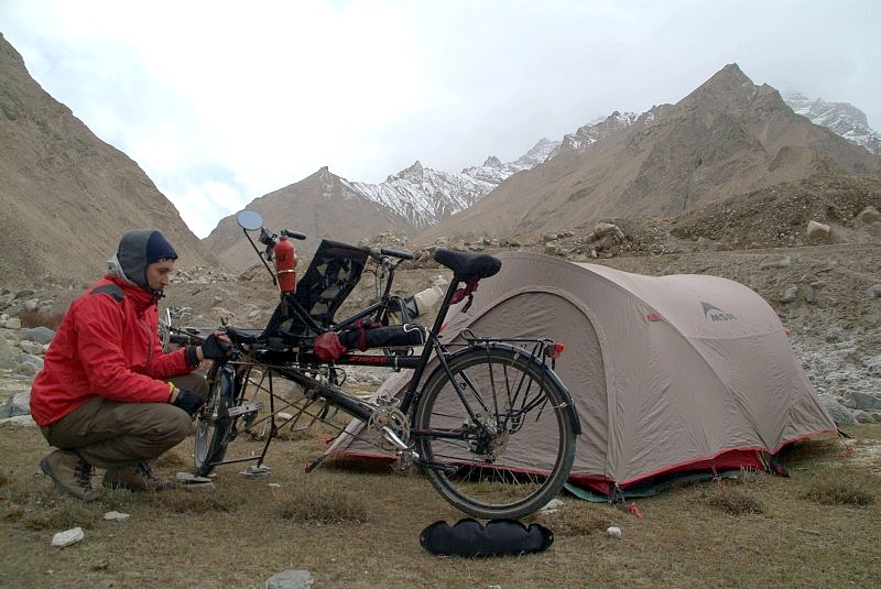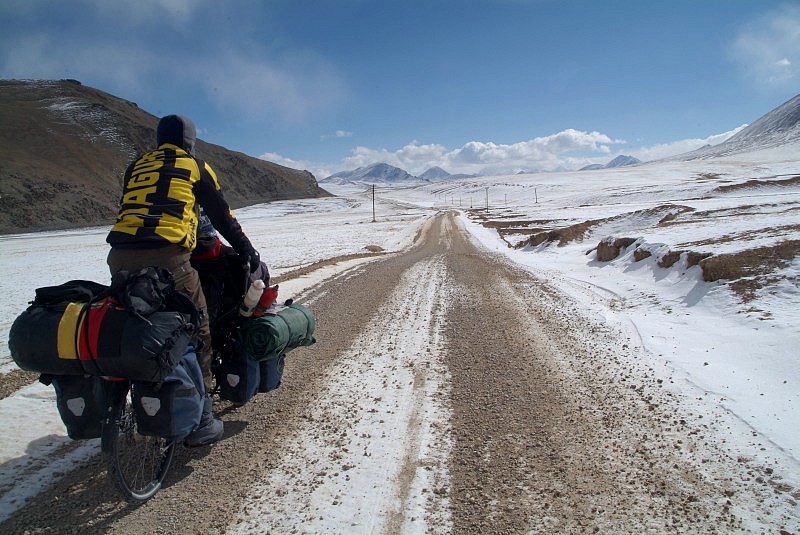Der Wecker klingelt und jede Bewegung meiner Beine tut weh. Es sind nur noch 11 Kilometer bis zum höchsten Pass unserer bisherigen Reise, und eine lange Abfahrt danach würde uns zum Dorf Mazar bringen, wo uns Wärme und gutes Essen erwarten würde, doch am liebsten würde ich heute einen Ruhetag einlegen. Als ich raushumpele, ist keine Wolke am Himmel zu sehen, die Sonne wärmt schon und ich denke mir "Komm jetzt, reiss' dich mal zusammmen, es sind nur noch 11 Kilometer bis zum Pass und wir haben endlich mal gutes Wetter". Wir packen alles zusammen und sitzen auch bald auf dem Rad. Schon nach den ersten Tritten steigen mir die Tränen in die Augen, die Knie tun so weh wie nie zuvor. Auch wenn wir vielleicht ein wenig Zeit mit dem Taxi durch die flache Ebene gespart haben, so kommt jetzt die schmerzhafte Erkenntnis, dass uns das Training gut getan hätte und wir nun durch schlechte Kondition die Zeit verlieren, die wir gehofft haben einzusparen. Das erste Mal auf der Reise nehme ich eine Schmerztablette um voranzukommen. Wie erwartet sind wir extrem langsam, wir müssen noch einen Platten flicken, doch die Knieschmerzen verschwinden und stattdessen habe ich nun Kopfschmerzen. Die Höhe bringt unseren Puls schon nach 30 Metern Fahrt wie nach einem 100 Meter Sprint zum rasen und ich bekomme eine leise Ahnung, wie schwierig die Anstrengung für Bergsteiger auf 8000 Meter Höhe sein muss. Erst zwei Stunden vor Sonnenuntergang erreichen wird den Pass und nach einer langen Abfahrt verkünden wenige rauchende Schornsteine aus Baracken in Mazar Wärme und gutes Essen. Es ist nur eine winzig kleine Hütte mit wenigen Tischen und Stühlen, doch in der Mitte bollert ein Ofen, vor dem ein kleiner, von allen gehätschelter Hund liegt. Im Raum nebenan gibt es zwei Reihen mit Liegen, auf denen wir zwei Nächte schlafen und erst mal einen Ruhetag einlegen, obwohl wir ja noch gar nicht so viel gefahren sind.