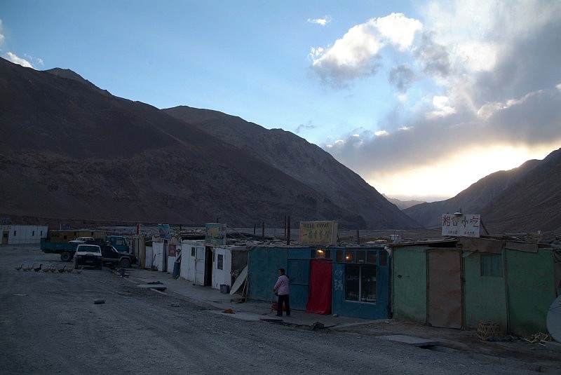Am Morgen ist mir schlecht und kalt. Radfahren? Der nächste und erste tibetische Ort Sumxi ist 59 Kilometer entfernt, das ist mir heute zu weit und es geht mir nicht gut. Doch gegen Mittag fühle ich mich besser und Benny scherzt noch: "Achja, als du geschlafen hast, bin ich mal ein paar Meter gegangen und habe in Tielong etwas gegessen". "Das wäre ein schlechter Witz, wenn das wahr ist" kontere ich und gleichzeitig beginnt es zu rattern. Wir sind bereits vier Kilometer hinter dem Punkt, wo Tielong sein soll, aber war nicht von Baracken die Rede,und nicht von einem einzelnen Komplex? In Erwartung einer längeren Fahrt quäle ich mich aufs Rad und dann, nach nur einem Kilometer - ihr könnt es euch sicher schon denken - war Tielong, Restaurants und Schlafmöglichkeiten in Baracken! So beendeten wir die wohl kürzeste Etappe nach nur 1,2 Kilometern mit einem ungläubigen Lächeln auf den Lippen in einem kleinen chinesischen Restaurant.