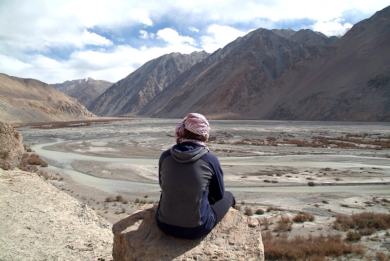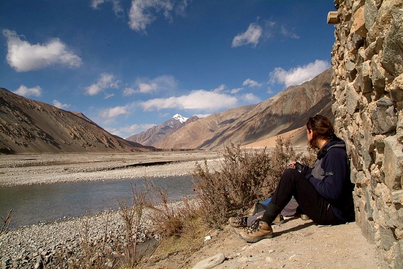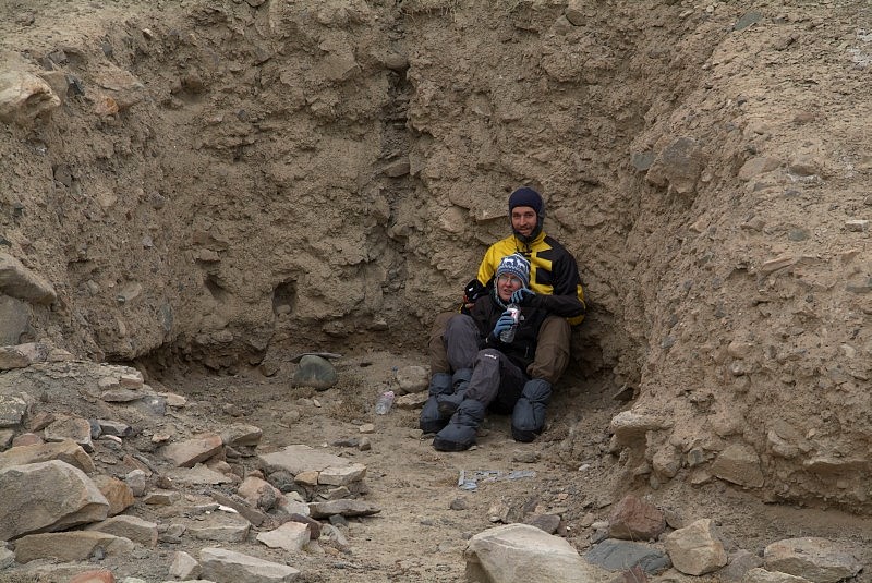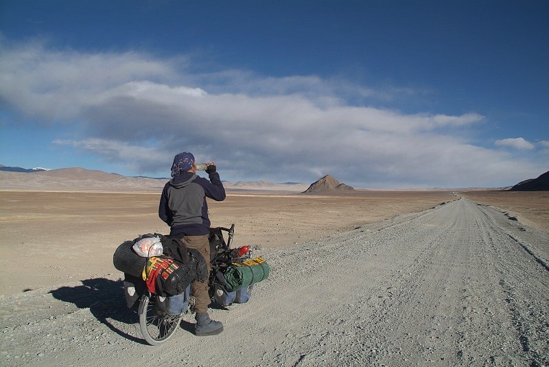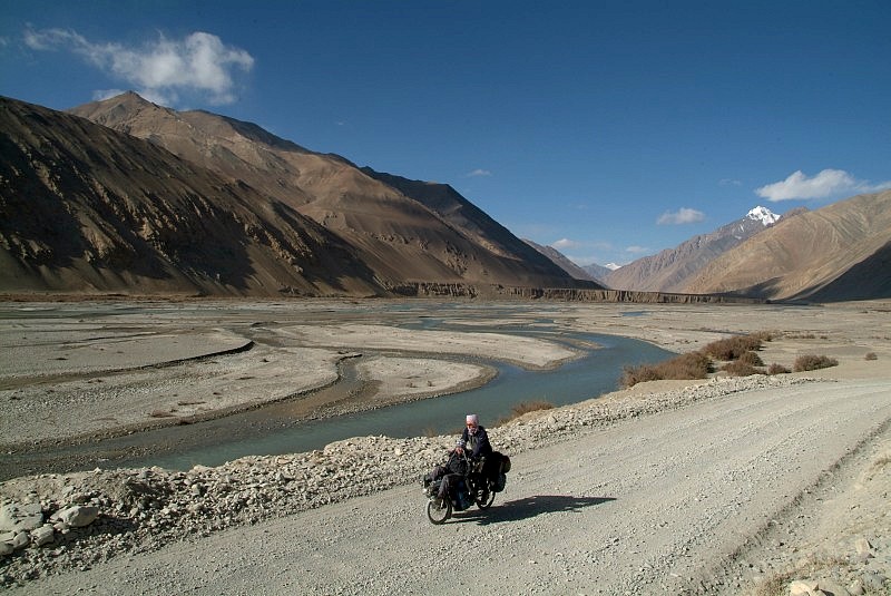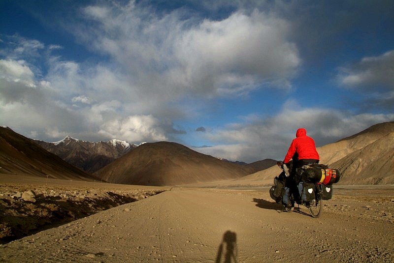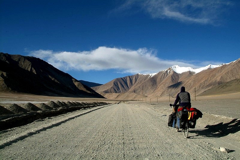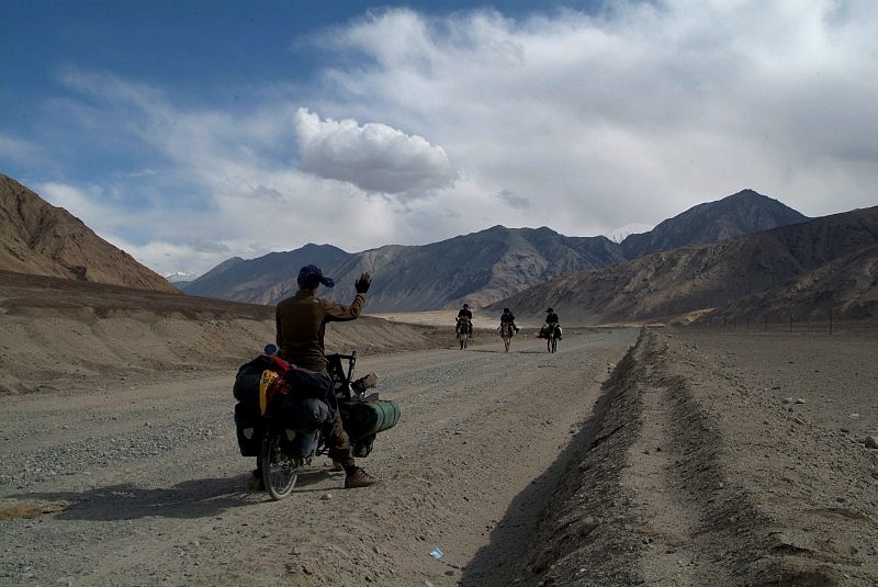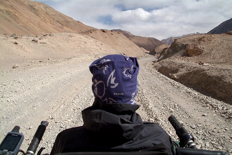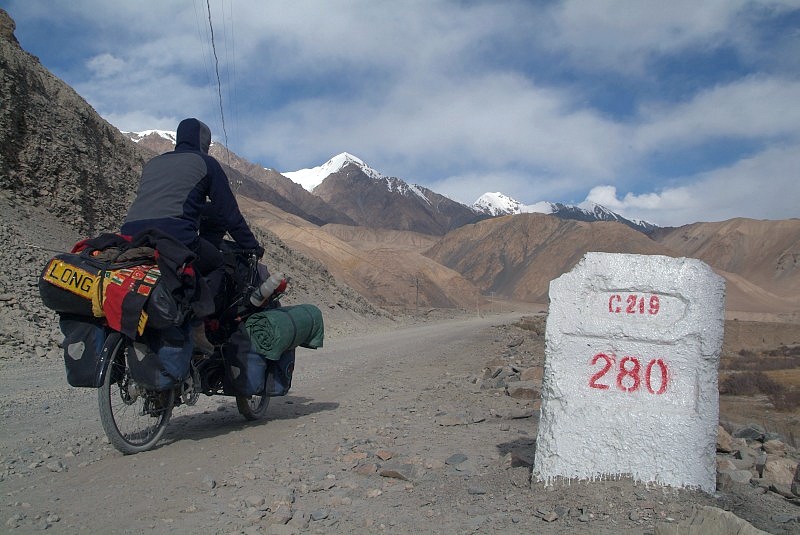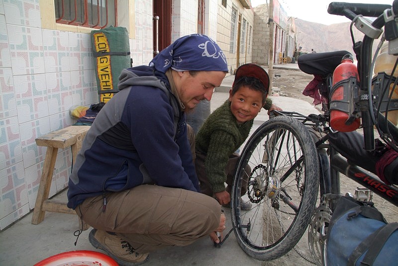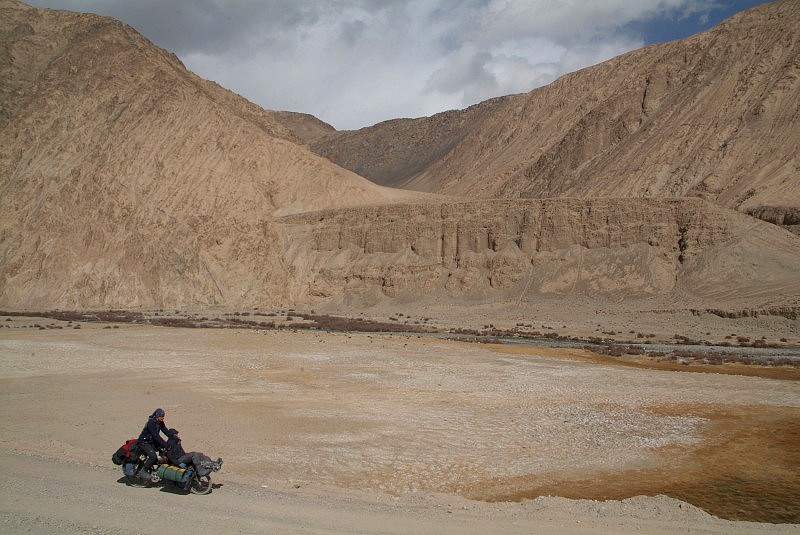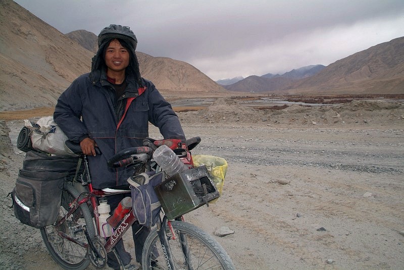 Von Mazar aus geht es weiter entlang eines Flusses. Es ist angenehm warm im Flusstal auf 3800 Metern. Angenehm warm, das heisst, wir fahren mit langer Unterwäsche und darüber zwei Pullovern. Hier erwartet uns angeblich unsere erste richtig schlechte Strasse, sprich einer Oberfläche wie bei einem Waschbrett, wo wir auf unserem Fahrrad so richtig durchgeschüttelt werden. Jetzt haben wir nicht mehr mit dem Berg zu kämpfen, sondern kommen aufgrund von der schlechten Strasse nur mit einem Schnitt von unter 9 km/h voran. Doch ganz allmählich scheint die Form zurückzukommen, und wir schaffen in über 5 Stunden immerhin 48 Kilometer. Am nächsten Tag geht es auf den nächsten Pass: Wieder knapp 5000 Meter hoch, schaffen wir es diesmal zumindest bis zum frühen Abend auf die Passhöhe, und sind froh, auf der anderen Seite schnell an Höhe zu verlieren, da wir uns beide nicht allzu wohl fühlen. In einem nicht ganz verlassenen Strassenbauarbeiterhaus bekommen wir von zwei Uighuren noch Brot geschenkt. Danach verkriechen wir uns schnell in unseren Schlafsäcken für eine weitere der Nächte, die nun immer kälter werden. So langsam geht es nämlich in Richtung des Aksai Chin Plateaus, eine der grössten Hochebenen der Erde. In den Bruchbuden von Xaidulla geniessen wir noch einmal eine warme Nacht, bevor wir die nächsten 9 Tage bei zum Teil eisigen Temperaturen zelten müssen.