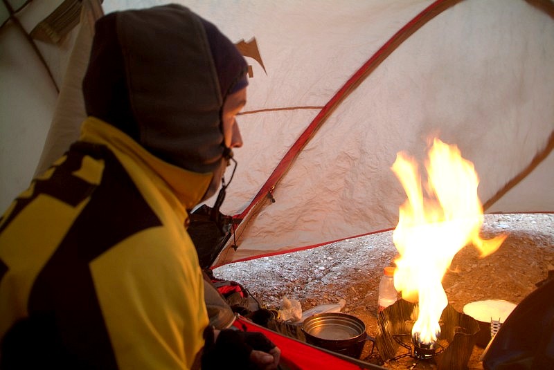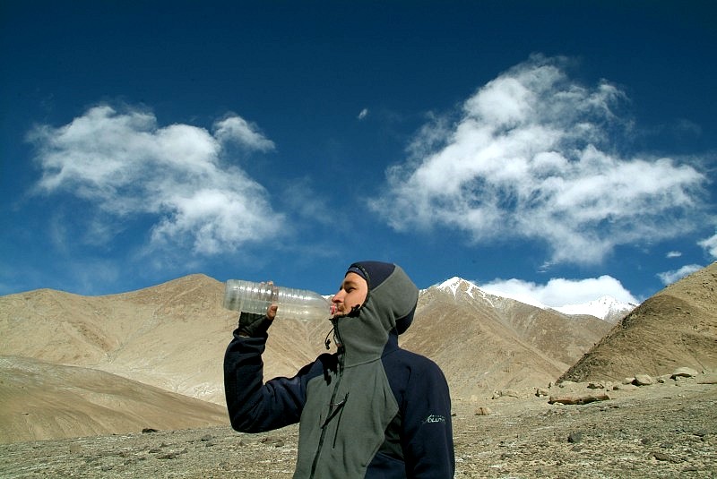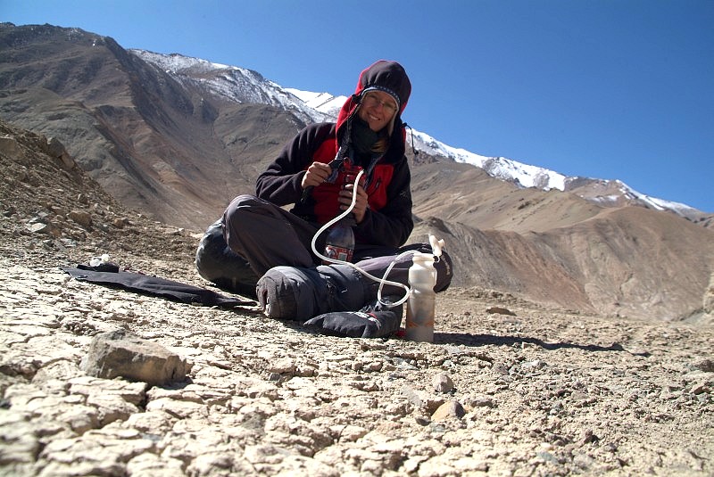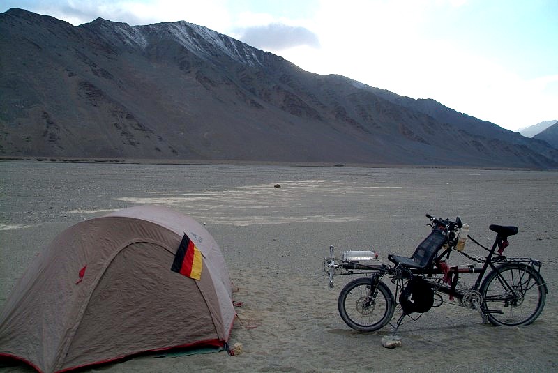 Ich bin fix und fertig und die Aussicht auf die Nacht ist miserabel, denn der Stopp in Tielong war eingeplant. Unser Wasserfilter gefriert vor Kälte und wir haben nur noch wenig Benzin, um zu kochen und um Wasser für uns sicher zu machen. Denn obwohl das Wasser hier so klar und sauber aussieht, kann man sich leicht die Reisekrankheit Gardia holen. Auch unsere Verpflegung ist mager, und schon wieder Müsli essen? Ein paar Jeepfahrer schenken uns Brot, Erdnüsse und Eier. Auf den Matten essen wir etwas, doch es ist zu kalt und windig. Der Kocher streikt zunächst, das Wasser im Filter gefriert und mir ist so unglaublich kalt, dass ich lange wie gelähmt auf unseren Matten sitze. Kleinste Anstrengungen fallen mir schwer, und mir wird auch so langsam alles egal. Benny geht es da noch besser, und während ich so gut es geht Sachen zu den Matten schleppe, baut er das Zelt auf. Wir schlafen wieder auf über 5000 Metern Höhe. Des Nachts will mich Benny erst wecken, weil er denkt dass Tiere ums Zelt streifen und schnaufen. Doch Fehlalarm, der schnaufende Rasselbock war nämlich ich!